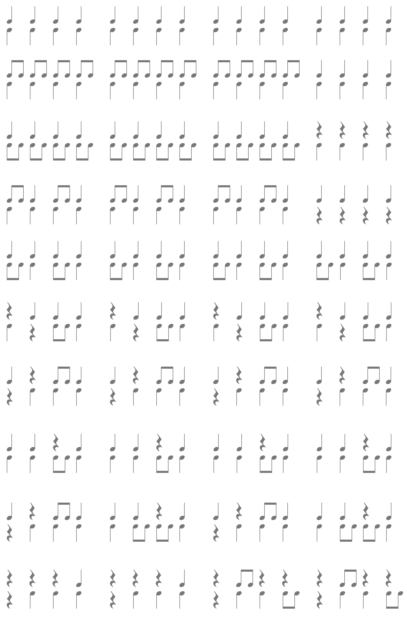 Lectura de motivos rítmicos secuenciales con figuraciones de negra y corchea. (aplicando al manejo de las baquetas) se sugiere hacer prácticas en compás 4/4 y 2/4.